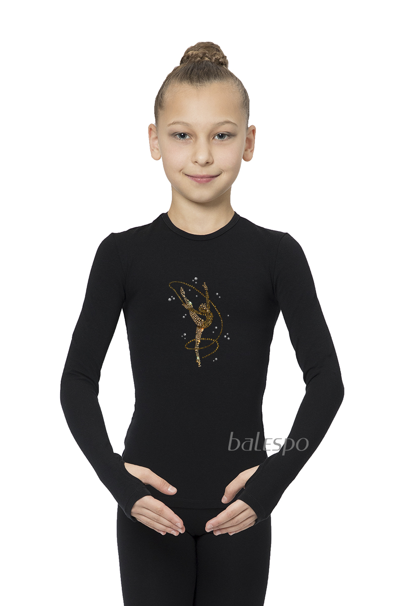 Thumb hole cuffs long sleeve top BALESPO BC 230.1-100 with gold crystals "Gymnast with ribbon".
